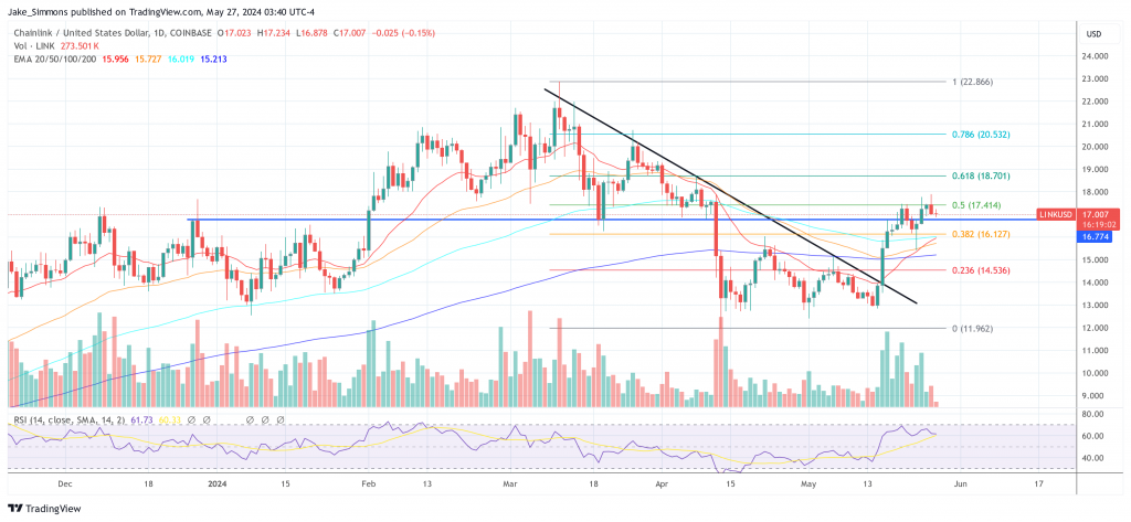 As the Consensys 2024 conference commences this week in Austin, Texas, the LINK community is abuzz with anticipation over a potential pivotal announcement from Chainlink in collaboration with SWIFT. Speculations are rife that this announcement, set for May 30 during a session on tokenization, could significantly influence LINK’s market performance. Chainlink And Swift Partnership Going To The Next Level? The session titled “How Swift and Chainlink Are Working Together to Unlock Tokenized Assets At Scale” will take place on the Mainstage at the Austin Convention Center. It features Jonathan Ehrenfeld, Head of Securities and Digital Assets Strategy at SWIFT, and Sergey Nazarov, Co-Founder of Chainlink. The session aims to explore how the two entities are collaborating to connect traditional financial infrastructure with the burgeoning multi-chain economy. This partnership is crucial for enabling a global system of on-chain finance for tokenized assets, which could streamline and enhance the security of cross-chain transactions. Related Reading: Chainlink On Fire: Price Nears $18, Profit Ratio Blazes To 2022 Levels This development follows a series of successful experiments conducted in June 2023, where SWIFT, alongside major financial institutions like BNP Paribas and BNY Mellon, demonstrated SWIFT’s potential as a unified access point for various blockchain networks. These tests included token transfers within and across different blockchain platforms, showcasing a stride toward integrating digital assets globally. Chainlink’s role as a leading provider of on-chain data and cross-chain interoperability solutions makes it a strategic partner for SWIFT, which has historically been the backbone for global financial communications across over 11,000 banks. The potential announcement is speculated to revolve around further advancements in this collaborative effort, which may include launching new protocols or a mainnet launch. Furthermore, Sergey Nazarov’s participation in another significant discussion at the conference, scheduled for May 29, titled “Building the Tokenized Asset Economy | Chainlink and Securitize,” adds to the gravity of the week’s events. Here, Nazarov, alongside Carlos Domingo, Co-Founder and CEO of Securitize, will delve into the multi-trillion-dollar tokenization opportunity, discussing strategies for blockchain projects and capital markets institutions to optimize their approaches to tokenization. Related Reading: Crypto Analyst Sounds Warning Alarm For Potential 50-60% Crash In Chainlink Price, Here’s Why The recent $47 million strategic funding round led by BlackRock for Securitize, which coincided with the launch of BlackRock’s first tokenized fund (BUIDL) on Ethereum, underscores the accelerating interest and investment in blockchain and tokenization technologies. With Securitize, Chainlink could ink another major player in the field of tokenization. LINK Price Is Ready To Skyrocket The outcomes of these sessions and the anticipated announcement could significantly impact the LINK price. Notably, the LINK price is in a good position in the daily chart. On May 16, LINK’s price successfully broke above a descending trend line that had previously capped its price action for approximately two months. This trend line, originating from early mid-March, had been a barrier for any bullish momentum, with the price consistently rejecting this dynamic resistance until the mentioned breakout. Following this pivotal breakout, LINK’s price trajectory shifted as it began a rally towards higher price levels. Notably, the price rallied to the 0.5 Fibonacci retracement level, which is calculated from the local high in early March to the significant low in mid-April. This level, sitting at approximately $17.41, has become a crucial focal point for both traders and analysts. Since reaching the 0.5 Fibonacci level, LINK’s price has entered a phase of consolidation, fluctuating within a narrow range defined by the 0.5 and 0.382 Fibonacci levels—the latter at around $16.13. This price behavior indicates a tug-of-war between buyers and sellers, trying to establish a more defined market direction. A convincing break above this level could signify a continuation of the bullish momentum, potentially leading to further gains. Technical traders might be closely watching this level, as a breakout could validate the bullish sentiment further and could see the price aiming for the next Fibonacci levels at $18.70 (0.618), $20.53 (0.786) and 22.86 (1.0). Featured image created with DALL·E, chart from TradingView.com