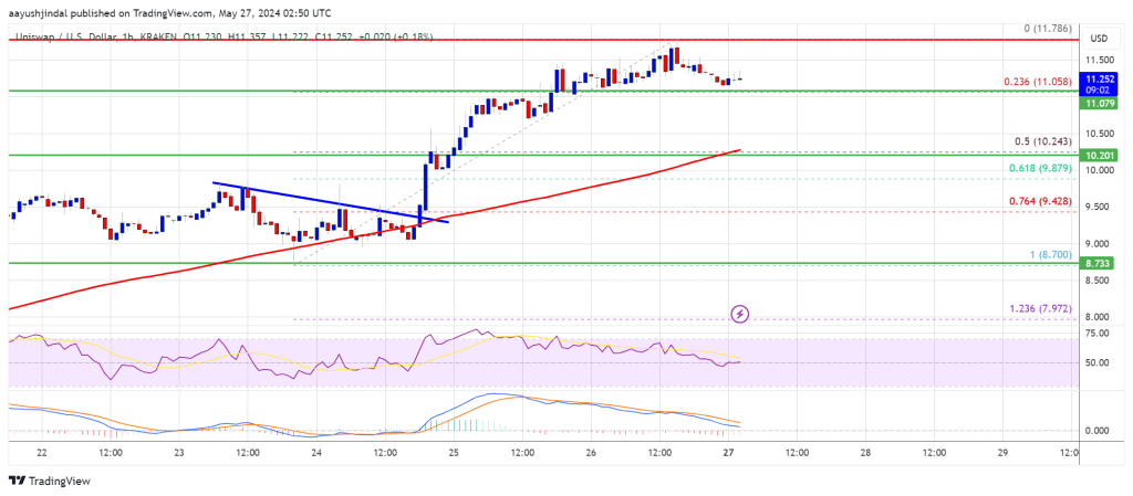 UNI price started a decent increase above the $$10.00 resistance. Uniswap is showing positive signs and might eye more upsides above the $11.75 resistance. UNI started a fresh increase above the $10.00 resistance zone. The price is trading above $11.00 and the 100-hourly simple moving average. There was a break above a connecting bearish trend line with resistance near $9.50 on the hourly chart of the UNI/USD pair (data source from Kraken). The pair might correct gains, but the bulls might eye more upsides above $11.75 in the near term. UNI Price Holds Gains After forming a base above the $8.80 level, Uniswap started a fresh increase like Bitcoin and Ethereum. UNI price gained pace for a move above the $9.20 and $9.50 resistance levels. There was a break above a connecting bearish trend line with resistance near $9.50 on the hourly chart of the UNI/USD pair. The bulls even pushed the price above the $10.50 and $11.20 resistance levels. Finally, the bears appeared near the $11.75 zone. A high was formed near $11.78 and the price is now consolidating gains near the 23.6% Fib retracement level of the upward move from the $8.70 swing low to the $11.78 high. UNI is now trading above $11.00 and the 100-hourly simple moving average. Immediate resistance is near the $11.50 level. The next key resistance is near the $11.75 level. A close above the $11.75 level could open the doors for more gains in the near term. The next key resistance could be near $12.20, above which the bulls are likely to aim a test of the $12.50 level. Any more gains might send UNI toward $13.50. Are Dips Supported In Uniswap? If UNI price fails to climb above $11.50 or $11.75, it could start a downside correction. The first major support is near the $11.05 level. The next major support is near the $10.25 level or the 50% Fib retracement level of the upward move from the $8.70 swing low to the $11.78 high. A downside break below the $10.25 support might open the doors for a push toward $8.80. Technical Indicators Hourly MACD – The MACD for UNI/USD is losing momentum in the bullish zone. Hourly RSI (Relative Strength Index) – The RSI for UNI/USD is near the 50 level. Major Support Levels – $11.05, $10.50, and $10.25. Major Resistance Levels – $11.50, $11.75, and $12.20.