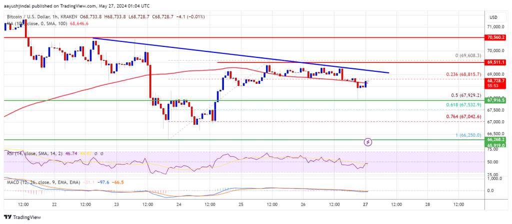 Bitcoin price is slowly losing momentum and struggling below $70,000. BTC is now consolidating and facing hurdles near the $69,500 resistance zone. Bitcoin is facing many key hurdles near the $70,000 zone. The price is trading above $69,500 and the 100 hourly Simple moving average. There is a key bearish trend line forming with resistance at $69,100 on the hourly chart of the BTC/USD pair (data feed from Kraken). The pair could continue to move down if it stays below the $70,000 zone. Bitcoin Price Stuck Below $70K Bitcoin price found support above the $66,000 level and started another increase. BTC was able to clear the $68,000 resistance zone. However, the bears were active near the $69,500 and $70,000 levels. A high was formed near $69,608 and the price is now correcting gains. There was a move below the 23.6% Fib retracement level of the upward move from the $66,250 swing low to the $69,608 high. It even tested the $68,000 support zone. The bulls are now active near the 50% Fib retracement level of the upward move from the $66,250 swing low to the $69,608 high. Bitcoin price is trading above $69,500 and the 100 hourly Simple moving average. If there is a fresh increase, the price might face resistance near the $69,000 level. There is also a key bearish trend line forming with resistance at $69,100 on the hourly chart of the BTC/USD pair. The first major resistance could be $69,500. The next key resistance could be $70,000. A clear move above the $70,000 resistance might send the price higher. In the stated case, the price could rise and test the $71,200 resistance. Any more gains might send BTC toward the $72,000 resistance. More Losses In BTC? If Bitcoin fails to climb above the $69,500 resistance zone, it could continue to move down. Immediate support on the downside is near the $68,000 level. The first major support is $67,500. The next support is now forming near $67,000. Any more losses might send the price toward the $65,500 support zone in the near term. Technical indicators: Hourly MACD – The MACD is now losing pace in the bearish zone. Hourly RSI (Relative Strength Index) – The RSI for BTC/USD is now below the 50 level. Major Support Levels – $67,500, followed by $67,000. Major Resistance Levels – $69,100, and $69,500.
