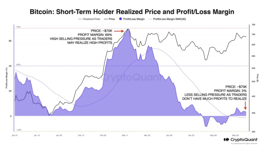 The world’s largest cryptocurrency, Bitcoin (BTC), has been consolidating over the past week, trading between $67,000 and $70,000 after experiencing a brief 20% price correction that sent it as low as $56,400 in early May. This consolidation period comes as inflows into the US spot Bitcoin ETF market have reignited, and selling pressure appears to have cooled off, both in the ETF market and among Bitcoin investors more broadly. Bitcoin Selling Pressure Fades According to Julio Moreno, head of research at on-chain market analytics firm CryptoQuant, the current Bitcoin price level of $70,000 differs from when it last reached that mark in March. Moreno notes that traders are now exerting much lower selling pressure, as unrealized profits are only around 3%, compared to 69% in early March. This suggests that much of the “heavy selling” has been exhausted, as seen in the chart below. Related Reading: DeFiance Capital Foresees ETH Soaring To $4,500 Pre-Ethereum ETF Trading Santiment data also shows that Bitcoin has once again eclipsed a $70,000 market capitalization, even as the US stock market took a hiatus for the Memorial Day holiday. Market intelligence platform Santiment sees this as an encouraging sign, as it demonstrates BTC’s ability to perform positively on days when it is not closely correlated with the primary stock market, which has been the case for much of 2022. Final Pre-Breakout Consolidation Phase Despite this positive momentum, crypto analyst Rekt Capital has noted that Bitcoin’s latest weekly candle closed below the range high resistance of its ongoing “re-accumulation” phase, which spans roughly $60,000 to $70,000. This likely sentences the leading cryptocurrency to further consolidation within this range, aligned with Rekt Capital’s thesis that two phases remain in the current bull cycle: the post-halving re-accumulation phase and the “parabolic rally phase.” Historically, Bitcoin has tended to consolidate around all-time highs before embarking on the most illustrative stretch of its bull cycles. According to the analyst, Bitcoin has indeed been consolidating at these highs for quite some time now, especially by the standards of previous cycles. While there is still room for further sideways trading at these elevated price levels, the time remaining in this phase is slowly running out. This leads to the belief that the long-awaited post-Halving rally, coupled with renewed investor sentiment, is poised to take the largest cryptocurrency on the market to even higher levels than the current $73,700 reached in mid-March. Related Reading: Crypto Analyst Predicts 28,900% Rally To $154 For XRP Price, Here’s When As such, Bitcoin appears to be entering a critical juncture in its current bull cycle. The consolidation and re-accumulation that has dominated the market in recent months could soon give way to the next parabolic surge, should historical patterns hold. As of now, BTC has gained 2% in the past 24 hours, adding to its 10% positive movement in the past month alone. Bitcoin is currently trading at $70,200. Featured image from Shutterstock, chart from TradingView.com