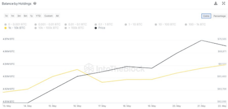 Bitcoin whales have continued to show their resilience and unwavering bullishness on the flagship crypto. This category of investors has accumulated a significant amount of the crypto token in the last seven days amid heightened volatility in Bitcoin’s price. Bitcoin Whales Accumulate $1.4 Worth Of BTC Data from the market intelligence platform IntoTheBlock shows that Bitcoin addresses holding between 1,000 and 10,000 BTC have combined to accumulate 20,000 BTC ($1.4 billion) over the past seven days. This accumulation coincides with Bitcoin’s recent price surge above $70,000. Furthermore, these whales’ purchases suggest that volume is picking up for the flagship crypto, which could help trigger more price rallies. Moreover, on-chain analytics platform Glassnode noted in a recent market report that the selling pressure on Bitcoin was declining. Therefore, Bitcoin’s price looks primed to take off sooner rather than later with significant buys like the one made by these whales. Related Reading: Non-Empty USDC And USDT Wallets See 13.9% And 15.7% Spike, Why This Is Good For Crypto Meanwhile, institutional investors are also back in the fold and look to be doubling their bets on the flagship crypto. This is evident in the fact that inflows into the Spot Bitcoin ETFs have picked up over the last two weeks. Data from Farside Investors shows that these funds have taken in almost $800 million in this week alone. Crypto analyst James Check (also known as Checkmatey) noted in a recent market report that these funds could lead the next wave of demand, driving Bitcoin’s price to a new all-time high (ATH). These Spot Bitcoin ETFs have already been instrumental to Bitcoin’s growth this year, with the flagship crypto hitting its current ATH of $73,750 earlier in March. Like Check, crypto analyst Gustavo Faria also noted in a recent blog post that there are signs that a new wave of demand is emerging. This has raised the possibility of the next rally happening even sooner than expected. Crypto analysts like BitQuant have provided insights into how high Bitcoin could rise on its next leg up, predicting that the crypto token will reach $95,000. No Need To Worry About Price Dips On-chain analytics platform Santiment suggested there was no need to worry about any price correction for Bitcoin as the bulls have enough capital to buy up these dips. The platform highlighted that the amount of non-empty stablecoin wallets is rising, indicating that more whales are loading up their bags to invest in the crypto market. Related Reading: Pundit Predicts Shiba Inu Competitor Dogwifhat Will Reach $10 Amid Short liquidations Specifically, USDC non-empty wallets have grown by over 13%, and Tether non-empty wallets have grown by over 15%. This figure is expected to keep rising as the bull run progresses later in the year. At the time of writing, Bitcoin is trading at around $67,200, down over 3% in the last 24 hours, according to data from CoinMarketCap. Featured image created with Dall.E, chart from Tradingview.com