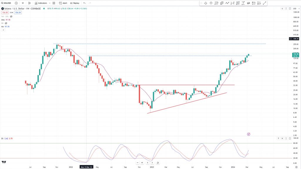 Crypto analysts are turning increasingly bullish on Solana (SOL), with forecasts suggesting a potential 50% surge in the near future. Following SOL’s 11% surge in the past 24 hours, several renowned analysts came forward to express their bullish stance. Solana Price Poised For Rally Towards $250 On X, crypto trader Bob Loukas (@BobLoukas) has provided an optimistic outlook, stating, “SOL now based and fuel up for leg to $250.” This statement is based on a thorough analysis of the weekly SOL/USD chart. The chart exposes that SOL has transformed its March 2022 resistance level of around $140 into a robust support zone. Previously, this level served as a strong resistance from mid-December last year until the beginning of March. Related Reading: Solana Demand Soars As Institutions Buy Up SOL At A Massive 870% Premium By converting this resistance into support, SOL is now poised for a rally towards $250. This price target is just $10 shy of Solana’s all-time high at around $260 from late October 2021. Adding to the bullish sentiment, crypto analyst Byzantine General (@ByzGeneral) remarked, “SOL looks pretty good to me. Leverage in the system has actually gone down while price is up and at the same time Coinbase has been buying a lot of spot.” Notably, not only the SOL/USD charts look ultra strong, but also the chart of SOL against its most fierce competitor in the fight for the superior layer-1 network, Ethereum. According to several analysts, SOL/ETH is primed for a major breakout. Christopher Inks, the founder of TexasWest Capital, shared his analysis, noting, “SOL/ETH on the weekly looks amazing. It doesn’t get much better than this with the wedge breakout while Stoch RSI is crossing bullishly in oversold and threatening to break out and RSI has bounced at neutral and is nearing a bullish cross. Breaking out above 0.04597 adds confidence to the rally toward a minimum expected target of 0.07231.” Related Reading: UNIBOT Crashes 37% Following End Of Cooperation With Solana Team This technical breakdown suggests a very optimistic future for SOL in comparison to ETH. If this technical setup plays out, SOL could outperform ETH by more than 70%. Macro expert Raoul Pal has also chimed in, stating, “SOL/ETH is looking like a breakout after a perfect consolidation… SOL is likely to take the lead again soon.” Pal’s analysis is based on a falling wedge correction pattern, a bullish signal, which SOL/ETH has already broken out from. However, it is important to note that this breakout needs to be confirmed to avoid being considered a fakeout, indicating a potential major breakout against ETH. Renowned trader Peter Brandt, commenting on Pal’s analysis, identified the pattern as a “Classic Schabacker falling wedge correction,” a bullish signal typically indicating a potential reversal or continuation of the trend. The Falling Wedge pattern, characterized by converging trend lines, decreasing volume, and a breakout with increased volume, suggests that SOL’s current pattern positions it for significant upward movement. At press time, SOL traded at $168.59, surpassing the 0.618 Fibonacci retracement level in the weekly chart. Featured image from Shutterstock, chart from TradingView.com