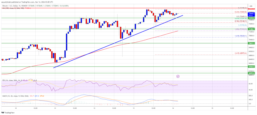 Bitcoin price is eyeing more gains above the $73,000 resistance. BTC is setting up for a move toward the $75,000 resistance in the near term. Bitcoin price is showing positive signs and eyeing more gains above the $73,000 zone. The price is trading above $72,500 and the 100 hourly Simple moving average. There is a connecting bullish trend line forming with support at $72,800 on the hourly chart of the BTC/USD pair (data feed from Kraken). The pair could continue to move up if it clears the $73,450 and $73,500 resistance levels. Bitcoin Price Sets New ATH Bitcoin price remained well-bid above the $72,000 level. BTC formed a base and started a fresh increase above the $72,500 resistance. The price even broke the $73,000 level. It traded to a new all-time high above $73,500 before there was a downside correction. The price declined below the $73,000 and $72,500 levels. A low was formed near $71,725 and the price is again rising. There was a move above the $73,000 level. Bitcoin is now trading above $72,500 and the 100 hourly Simple moving average. It is holding gains above the 50% Fib retracement level of the upward move from the $71,725 swing low to the $73,485 high. Source: BTCUSD on TradingView.com Immediate resistance is near the $73,200 level. The next key resistance could be $73,500, above which the price could rise toward the $74,200 resistance zone. If there is a clear move above the $74,200 resistance zone, the price could even attempt a move above the $75,000 resistance zone. Any more gains might send the price toward the $76,500 level. Another Downside Correction In BTC? If Bitcoin fails to rise above the $73,500 resistance zone, it could start a downside correction. Immediate support on the downside is near the $72,800 level and the trend line. The first major support is $72,150 or 76.4% Fib retracement level of the upward move from the $71,725 swing low to the $73,485 high. If there is a close below $72,150, the price could start a decent pullback toward the $70,000 level. Any more losses might send the price toward the $68,500 support zone. Technical indicators: Hourly MACD – The MACD is now gaining pace in the bullish zone. Hourly RSI (Relative Strength Index) – The RSI for BTC/USD is now above the 50 level. Major Support Levels – $72,800, followed by $72,150. Major Resistance Levels – $73,200, $73,500, and $75,000.