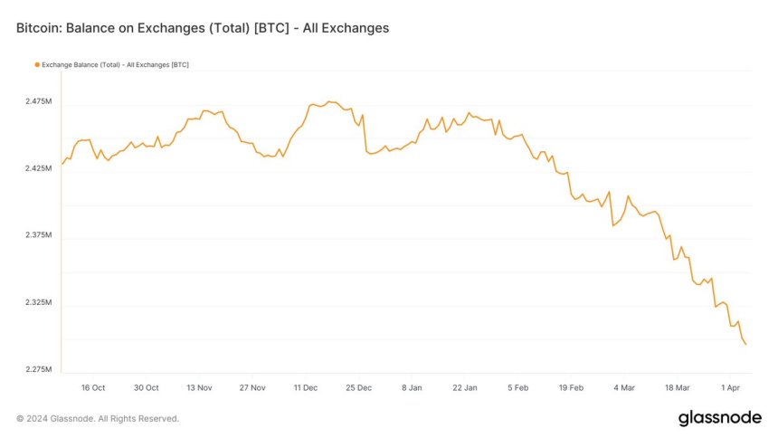 The Bitcoin price has somewhat slowed down since reaching the unprecedented high of $73,000, moving mostly sideways since mid-March. However, with the halving event less than a fortnight away, all eyes will be on the premier cryptocurrency and all that pertains to it over the next couple of weeks. According to a recent on-chain observation, the BTC supply on exchanges has been on a steady decline over the past few months. This trend has sparked discussions on what this could mean for the Bitcoin price, both in the short and long term. $7.55 Billion Transferred Out Of Exchange Wallets In The Past Month Prominent crypto pundit Ali Martinez took to the X platform to share that a significant amount of Bitcoin has been moved out of crypto exchanges over the past month. The relevant metric here is Glassnode’s Balance on Exchanges, which tracks the total amount of a cryptocurrency (Bitcoin, in this case) held across all exchange addresses. Related Reading: Bitcoin Short-Term Holders Go On 1.2 Million BTC Buying Spree, Is Retail Finally Here? A decrease in the value of this indicator implies that investors are making more withdrawals than deposits of Bitcoin into centralized exchanges. The metric’s increase, on the other hand, indicates that more BTC is flowing into these exchanges than leaving. Chart showing Bitcoin balance on all exchanges | Source: Ali_charts/X According to Martinez, about 111,000 BTC (worth approximately $7.55 billion) have been transferred out of known crypto exchange wallets in the past month. Typically, an exodus of funds (of this magnitude) suggests a significant shift in the sentiment of Bitcoin investors. While the exact rationale behind such a massive movement of Bitcoin remains unclear, the flow of funds from trading platforms suggests a growth in investor confidence. This implies that BTC owners are more interested in holding their assets in the long term rather than selling for short-term gains. Furthermore, this continuous downward trend in BTC’s balance on exchanges could set the stage for a bullish rally for the Bitcoin price. A sustained drop in the BTC’s supply on centralized exchanges could result in a supply crunch – a scenario where the supply of a particular asset is lower than its demand, leading to a surge in its value. Another potential bullish catalyst for the Bitcoin price is the upcoming halving event, which is expected to occur on April 18, 2024. With the miners’ rewards slashed in half and the production of Bitcoin slowed, this event is expected to impact the value of BTC positively. Bitcoin Price At A Glance As of this writing, the Bitcoin price stands at around $69,537, reflecting a 2.7% increase in the last 24 hours. Related Reading: Breakout Of The Year? Crypto Analyst Predicts Where NEAR Is Headed Next Bitcoin price on the verge of $70,000 on the daily timeframe | Source: BTCUSDT chart on TradingView Featured image from iStock, chart from TradingView