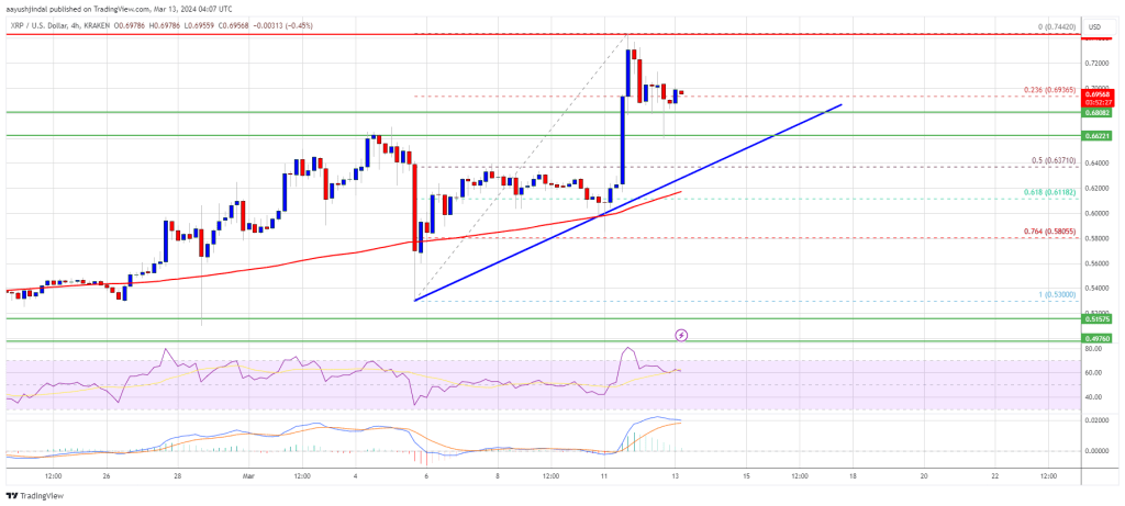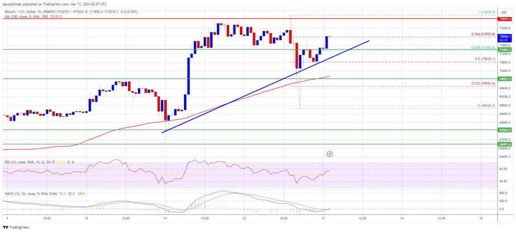 Bitcoin price is holding gains above the $70,000 resistance. BTC is now showing positive signs and might aim for a move above the $73,000 level. Bitcoin price extended its increase and tested the $73,000 zone. The price is trading above $71,500 and the 100 hourly Simple moving average. There is a connecting bullish trend line forming with support at $71,300 on the hourly chart of the BTC/USD pair (data feed from Kraken). The pair could continue to move up if it clears the $72,850 and $73,000 resistance levels. Bitcoin Price Sets New ATH Bitcoin price remained stable above the $70,000 level. BTC gained pace and was able to extend its increase above the $72,500 level. It even spiked above the $72,850 resistance but the upsides were limited. The price traded to a new all-time high at $73,000 before there was a downside correction. The price declined below the $72,000 and $71,500 levels. A low was formed near $68,660 and the price is again rising. There was a move above the $71,000 level. The price cleared the 50% Fib retracement level of the downward move from the $73,000 swing high to the $68,660 low. There is also a connecting bullish trend line forming with support at $71,300 on the hourly chart of the BTC/USD pair. Bitcoin is now trading above $71,500 and the 100 hourly Simple moving average. Immediate resistance is near the $72,000 level and the 76.4% Fib retracement level of the downward move from the $73,000 swing high to the $68,660 low. Source: BTCUSD on TradingView.com The next key resistance could be $72,850, above which the price could rise toward the $73,000 resistance zone. If there is a clear move above the $73,000 resistance zone, the price could even attempt a move above the $74,000 resistance zone. Any more gains might send the price toward the $75,000 level. Another Downside Correction In BTC? If Bitcoin fails to rise above the $72,000 resistance zone, it could start a downside correction. Immediate support on the downside is near the $71,300 level and the trend line. The first major support is $70,000 or 100 hourly SMA. If there is a close below $70,000, the price could start a decent pullback toward the $68,650 level. Any more losses might send the price toward the $66,500 support zone. Technical indicators: Hourly MACD – The MACD is now gaining pace in the bullish zone. Hourly RSI (Relative Strength Index) – The RSI for BTC/USD is now above the 50 level. Major Support Levels – $71,300, followed by $70,000. Major Resistance Levels – $72,000, $72,850, and $73,000.