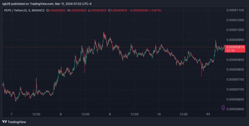 Pepe coin (PEPE) has been showing an incredible performance alongside the rest of the crypto market. This weekend, the two biggest cryptocurrencies, Bitcoin and Ether, displayed remarkable price growth. BTC keeps reaching new all-time highs (ATH), and ETH surpassed the $4,000 mark for the first time in two years. Similarly, PEPE joined the party after hitting a new ATH over the weekend, which prompted whales to take profit on their bags. Related Reading: Pepe Coin Soars Over 250% – Will March Bring More Surprises? Whale Makes Big Profits After Price Surge After its launch in April of last year, the frog-themed coin shook the crypto space and the memecoin market, becoming one of the most recognizable memecoins in the sphere. Despite the big start, PEPE’s price started fading as the market turned its eyes to competitors like BONK and other Solana-based memecoins. However, the bull run has propelled the market prices to heights unseen since 2022, and PEPE has taken advantage of the bullish momentum. As reported by the blockchain analytics platform Lookonchain, a whale made over 431% in profits in just two weeks. The address shows that the trader withdrew over 1 trillion PEPE tokens from Binance in three transactions before the price skyrocketed. In just 2 weeks, this trader made $8.13M(+431%) on $PEPE! This trader deposited 196.18B $PEPE($1.7M) to #Binance for profits 4 hours ago, with 1T $PEPE($8.31M) left. He withdrew 1.19T $PEPE(cost ~$1.88M) from #Binance before the price of $PEPE increased.… pic.twitter.com/FWZgIWcCYP — Lookonchain (@lookonchain) March 10, 2024 The first transaction of 713.12 billion PEPE was made 15 days ago when it was trading at around $0.00000138. The second withdrawal, about 316.36 billion tokens, was done a day later when the token price was $0.00000180. Finally, the trader withdrew 116.7 billion tokens one more time when the price was hovering around $0.00000269. Lookonchain said these withdrawals accounted for 1.19 trillion PEPE tokens, which cost about $1.88 million. Yesterday, the whale deposited 196.18 billion tokens back to Binance for profits of $1.7 million. The address still has 1 trillion PEPE left, worth around $8.13M at the time of the report. At the time of writing, these holdings had increased by over $1 million and were worth $9.13 million. As reported by NewsBTC, whales have profited from their PEPE holdings since the memecoin started its resurgence in late February. PEPE’s Massive 800% Surge Despite the volatile crypto market and whales selling large amounts of PEPE, its community seemingly feels confident in the frog-theme coin and considers it THE memecoin of this bull run. $PEPE will surprise everyone like $DOGE did in 2021. After the first Dogecoin pump in 2021, some people regretted not buying. Don't make the same mistake in 2024 with $PEPE. This is THE meme coin of this bullrun. pic.twitter.com/lUq213XwFQ — Tryrex (@Tryrexcrypto) March 9, 2024 Since the memecoin interest surged, Pepe coin has tagged along and shown massive growth. In the last 14 days, the token has registered a staggering 549% price. Even more impressively, the price has risen 799.5% in the past month. The token has climbed to the top of the memecoin ranking after flipping tokens like BONK and CorgiAI. PEPE now sits as the third largest memecoin with a market capitalization of $3.85 billion, an 8.41% increase in the last 24 hours. Similarly, its daily trading volume has increased by 16.85% to $1.49 billion, suggesting that market activity and interest in the memecoin have surged in the last day. At writing time, PEPE is trading at $0,000009135. This represents an 8.5% rise in 24 hours and a 5.95% decrease from its ATH of $0,000009793, registered two days ago. Related Reading: Crypto Expert Says Dogecoin, Shiba Inu, PEPE, Others Are About To Explode PEPE price performance in the 5-day chart. Source: PEPEUSDT on Tradingview.com Featured image from X.com, Chart from Tradingview.com