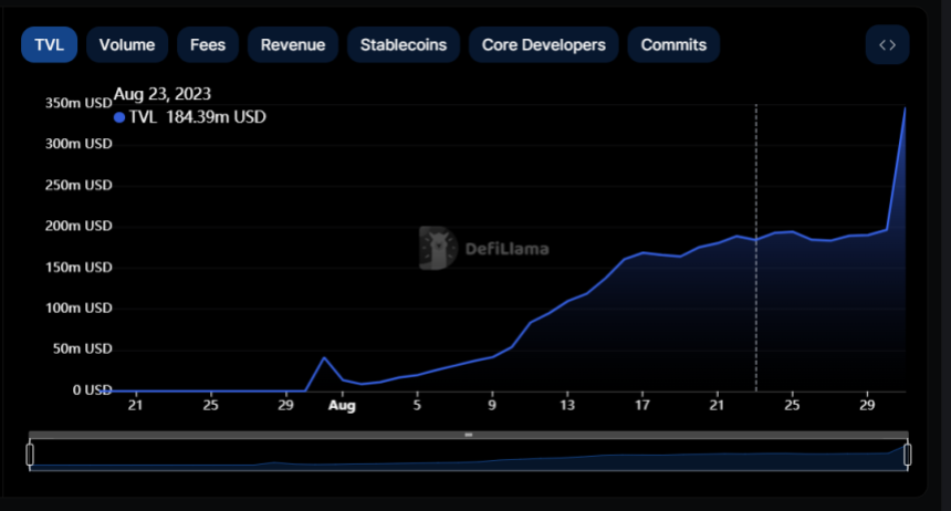 Base, an Ethereum layer 2 (L2) network developed by prominent cryptocurrency exchange Coinbase, has seen its total value locked (TVL) soar to new heights on Friday, August 31. This surge was triggered by the recent launch and growing hype around the decentralized exchange (DEX) platform Aerodrome. Total Value Locked on Base Reach $333 Million The total decentralized finance (DeFi) deposits on Base have hit a new all-time high following a nearly 76% spurt in the past 24 hours. According to data from DefiLlama, the network’s TVL currently stands at $346.39 million, jumping from $196.8 million a day ago. Total Value Locked on the Base network | Source: DefiLlama This sharp rise has seen Base leap into the top ten blockchains with the largest TVL, sitting above Solana in ninth position. However, Ethereum remains the dominant network in the decentralized finance space, with a total value of roughly $22.1 billion. 💥 BREAKING: Total Value Locked on @BuildOnBase has surpassed $300M and entered the top 10 blockchains with the largest TVL 🔵🚀 pic.twitter.com/KC7tClvA1g — Base Daily (@BaseDailyTK) August 31, 2023 Related Reading: Ethereum Holds Uptrend Support And Could Aim Fresh Rally To $1,800 Interestingly, this latest feat only underscores the overall progress of Base since opening its doors to the public on August 9, 2023. The Coinbase-incubated network’s TVL has swelled more than 733% since the public mainnet launch. One of the notable catalysts of the Base’s growth was the short-lived hype of the social media platform Friend.tech. However, activity on the decentralized app has since hit a snag, with trading fees dipping by more than 94%. Aerodrome Drives An Inflow Of $170 Million To Base As earlier mentioned, the latest resurgence in Base’s DeFi deposits was triggered by the growing interest in the Aerodrome protocol, which recently launched on the blockchain. Aerodrome is a decentralized exchange developed by the team behind Velodrome, a popular DEX on the Optimism chain. The platform rewards users who provide liquidity and participate in protocol governance with its native token, AERO. Related Reading: Coinbase (COIN) And Bitcoin-Related Stocks Soar Following Grayscale’s Victory Thanks to the AERO emissions, which began on August 30, Aerodrome has attracted more than $170 million in value to the Base network. Meanwhile, this has reflected a significant 6,000% rise in the protocol’s TVL in the past 24 hours. Despite the initial negative sentiment brewing around Base due to the BALD rug pull, and various DeFi protocol exploits, it appears that major cryptocurrency projects are continuing to expand to the layer 2 network. PancakeSwap, the second-largest decentralized exchange, is one of the protocols to have recently joined the trend. The DeFi platform went live on the Base network on Thursday, 30th of August. The cryptocurrency market cap on the daily timeframe | Source: TOTAL chart on TradingView Featured image from Pexel, chart from TradingView