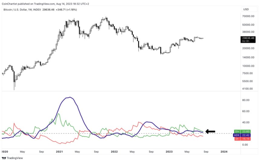 Bitcoin price remains stagnant for going on months now, with no clear trend developing and volatility in a downward spiral. However, some subtle signs are popping up that could suggest that a bullish Bitcoin trend is beginning to take shape. Make Friends With Strong Trends “The trend is your friend” is one of the most famous trading quotes, highlighting how capturing as much of the prevailing trend as possible can lead to the most profitable results. For this reason, in technical analysis, trend-following tools are among the most successful. But what is an investor or trader to do when there is a clear absence of any discernible trend? The answer is “to wait for the trend to appear” but that’s easier said than done. This is why specific tools have been created to tell when assets like Bitcoin or even stocks are trending or not. One such tool is starting to rise after several weeks of sideways price action, and it suggest that the underlying trend is strengthening. The Average Directional Index | BTCUSD on TradingView.com Bullish Bitcoin Is Building Muscle The Average Directional Index (ADX) is a trend strength measuring tool, created by the father of technical indicators, J. Welles, Wilder, Jr. Other tools Wilder built include the Parabolic SAR, Average True Range, and the Relative Strength Index. A reading above 20 on the ADX means a trend is developing. The more it turns up, the stronger the trend. After weeks of sideways, the trend is starting to strengthen again. The tool also includes two Directional Movement indicators, the DI+ and DI-. The DI+ is currently above the DI-, showing that bulls in control of the underlying price action. All that’s left is for the ADX to strengthen further and Bitcoin could finally break out of this range and begin trending. What Bitcoin bulls ultimately want to see next is for the ADX to grow even steeper, similar to what we can see in late 2020 and into early 2022. The lack of another strong trend at the second 2021 peak was a warning that something was off. Will the bullish trend continue to strengthen, or will bears regain control? #Bitcoin 1W Average Directional Index is turning back up above 20 — this is the signature of a strengthening trend DI+ is above DI- which shows bulls are in control Trend-following tools may soon prove more useful with a trend growing pic.twitter.com/9nAUEVIcL3 — Tony “The Bull” (@tonythebullBTC) August 14, 2023 Tony is the author of the CoinChartist (VIP) newsletter. Sign up for free. Follow @TonyTheBullBTC & @coinchartist_io on Twitter. Or join the TonyTradesBTC Telegram for daily market insights and technical analysis education. Please note: Content is educational and should not be considered investment advice. Featured image from iStockPhoto, Charts from TradingView.com