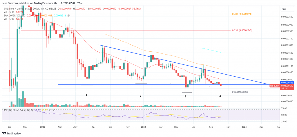 The Shiba Inu (SHIB) price currently treads on crucial technical terrains. As highlighted in previous comprehensive analysis, the potential impacts of two distinct chart patterns were observed on the 1-week timeframe for SHIB, both leading to vastly different price trajectories. The 1-week chart reveals a compelling quadruple bottom formation for SHIB. If this pattern materializes, it could suggest a bullish surge of up to 250% from its breakout point, as delineated in prior assessments. Conversely, a starkly contrasting pattern emerges in the form of a descending triangle, which has taken shape over a span of 60 weeks. A conclusive break below its defining neckline could induce substantial declines in SHIB’s valuation. Shiba Inu Price: Currently, the bearish sentiment around Shiba Inu seems to be intensifying in the wake of the crypto market downturn. With SHIB recording a price of $0.00000695 at the press time and briefly touching a low of $0.00000674 yesterday, it has breached the descending triangle’s neckline pegged at $0.00000715. Related Reading: Shiba Inu Stagnation: What’s Causing Meme Coin’s Recent Sluggishness? Should SHIB close this week below this key support level, it might portend strong bearish implications, possibly steering the price toward its annual low of $0.000006. Yet, a closure below $0.00000715, while foreboding, is not conclusively bearish. An analogous dip occurred in June, which was swiftly followed by a robust rally. Over an 8-week period, SHIB ascended by 59%, only to face resistance at the 50-day EMA of $0.00001140, leading to a renewed breach under the descending triangle’s trend line on the weekly chart. At this juncture, if SHIB can secure a weekly close above the $0.00000715 mark either this week or the next, it might bolster the case for the bullish quadruple bottom setup. So SHIB could see a similar rally to June this year. From a technical viewpoint, the cryptocurrency will then confront key resistance barriers: the 20-day EMA at $0.00000806, the descending triangle’s trendline approximately at $0.000009, and the 50-day EMA at $0.00001019. Subsequently, a monumental target, pinpointed at the 23.6% Fibonacci retracement level of $0.00002545, representing a rally in excess of 250%, could be attainable. Related Reading: Shiba Inu-Based BONE Gearing Up For Massive Rally, Here’s Why When interpreting these patterns, investors must decide whether the quadruple bottom or the descending triangle holds more weight for them, making it a buy or sell position. Community Insights In a recent post on X (previously known as Twitter), prominent SHIB influencer, Lucie, urged the Shiba Inu community to persevere: “In these turbulent times, it’s imperative for us to remain resilient. The crypto landscape is indeed tumultuous, inundated with unsettling global updates. However, as the formidable ShibArmy, our collective endeavours will undoubtedly yield dividends. Let’s remain united, weathering challenges and championing our shared vision.” Investors and traders are encouraged to exercise caution and conduct due diligence, keeping a close watch on the unfolding SHIB price narrative. Featured image from Shutterstock, chart from TradingView.com