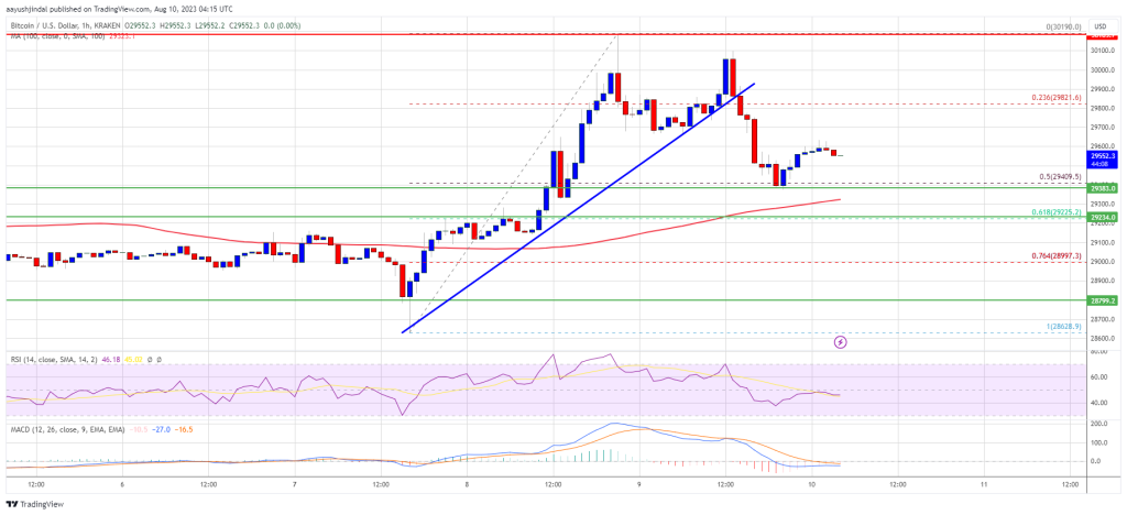 Bitcoin price started a downside correction from $30,200. BTC is now trading near the previous breakout resistance at $29,400. Bitcoin is correcting gains and trading below the $29,800 level. The price is trading above $29,400 and the 100 hourly Simple moving average. There was a break below a key bullish trend line with support near $29,840 on the hourly chart of the BTC/USD pair (data feed from Kraken). The pair could start another increase if it stays above the $29,400 support zone. Bitcoin Price Holds Support Bitcoin price started a decent increase above the $29,400 and $29,500 resistance levels. BTC even broke the $30,000 level but there was no daily close. A high was formed near $30,190 and the price started a downside correction. There was a move below the $30,000 and $29,800 levels. The price dipped below the 23.6% Fib retracement level of the upward move from the $28,628 swing low to the $30,190 high. Besides, there was a break below a key bullish trend line with support near $29,840 on the hourly chart of the BTC/USD pair. Bitcoin price is now trading above $29,400 and the 100 hourly Simple moving average. It is also holding the key pivot zone at $29,400. It is close to the 50% Fib retracement level of the upward move from the $28,628 swing low to the $30,190 high. Immediate resistance is near the $29,680 level. The first major resistance is near the $29,800 level. The next major resistance is near the $30,000 level, above which the price could revisit $30,200. Source: BTCUSD on TradingView.com A close above the $30,200 resistance might start another steady increase. In the stated case, the price could test $31,200 or even $32,000 in the coming days. More Losses In BTC? If Bitcoin fails to clear the $29,800 resistance, it could start a fresh decline. Immediate support on the downside is near the $29,400 level. The next major support is near the $29,300 level or the 100 hourly SMA. A downside break below the $29,300 level might spark bearish moves. In the stated case, the price could revisit $29,000. Any more losses might call for a move toward the $28,680 level in the near term. Technical indicators: Hourly MACD – The MACD is now gaining pace in the bearish zone. Hourly RSI (Relative Strength Index) – The RSI for BTC/USD is now below the 50 level. Major Support Levels – $29,400, followed by $29,300. Major Resistance Levels – $29,800, $30,000, and $30,200.