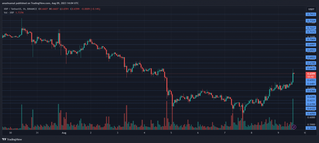 XRP has halted its decline by rising above the $0.60 price level. In the past 24 hours, its value increased by nearly 6%. However, XRP hasn’t yet shown significant gains on the weekly chart. Related Reading: Ethereum Crosses $1,800, But How Long Will Bullish Revival Last? The technical analysis suggests a positive trend for XRP, but there’s a chance that the coin could face more downward movement in the upcoming trading sessions. If buyers push the price higher, XRP might maintain its position above the current price level. Moreover, breaking through two crucial resistance levels could lead to a potential surge of over 9%. For XRP to keep rising, the broader market must provide support, particularly Bitcoin’s movement beyond the $30,000 zone. If buying momentum doesn’t recover, XRP might experience a decline and drop below its local support line. The increasing market capitalization of XRP indicates active buyer participation at the present moment. XRP Price Analysis: One-Day Chart At the time of writing, the altcoin was priced at $0.65. This value has presented significant resistance for the altcoin in recent weeks. The upcoming trading sessions hold critical importance as XRP must effectively surpass this level. Failing to achieve this could trigger a subsequent decline in the price. Furthermore, overhead resistance levels are $0.67, followed by $0.69. Should XRP successfully breach the $0.69 mark, the altcoin might trade around the $0.72 range. Conversely, a local support level is positioned at $0.63. Should the price dip below this threshold, it could potentially descend to $0.60, ultimately pausing the overall bullish sentiment. Technical Analysis For demand, XRP’s chart indicates its current state as overbought. The Relative Strength Index has reached 70, indicating buyers currently influence the price direction. This could imply the potential for a price correction in the upcoming trading sessions. While such a correction might not be prolonged, any drop in XRP’s value below $0.63 might reduce buyer activity. The asset’s price remained positioned above the 20-Simple Moving Average line. This observation signifies an increasing demand and emphasizes buyers’ role in steering the market’s price dynamics. Furthermore, the altcoin has generated buy signals in response to the rising demand. These buy signals are represented by the emergence of green histograms in the Moving Average Convergence Divergence indicator, signaling a bullish sentiment. Additionally, the Directional Movement Index presents a positive outlook, with the +DI (blue) line positioned above the -DI (orange) line, indicating a favorable price trajectory. Related Reading: Bitcoin Price Losses Steam Above $30K But The Bulls Are Not Done Yet Moreover, the Average Directional Index (Red) has crossed the 40 mark, implying an increase in the strength of the price trend. This development suggests XRP could yield additional gains in the near-term trading sessions. Featured image from Finbold, charts from TradingView.com