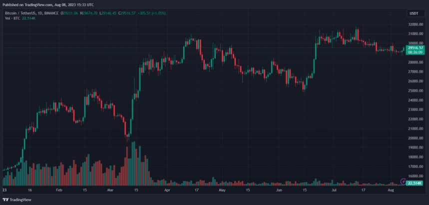 The Bitcoin price has experienced a slight uptick in the past 24 hours as bulls defended critical support. The number one cryptocurrency by market cap might try another run north of critical resistance, but recent data points towards further sideways price action. Related Reading: Terra Luna Token Burn Proposal Greenlit – Could $1 Be Hittable? As of this writing, Bitcoin trades at $29,400 with a 2% profit in the past day. Over the past week, the cryptocurrency has recorded similar profits while the rest of the market stalls or sees losses. Key resistance stands at around $30,000, but BTC failed to breach it on every recent occasion. Bitcoin Price Prepares… For Monotony? Over the past two years, the Bitcoin price has been moving in tandem with macroeconomic forces. In particular, BTC reacts to the tension from the U.S. Federal Reserve (Fed) and its interest rates hike program. The financial institution is entering a quiet period due to summer vacations. As a result, according to crypto analysis firm Blofin, Bitcoin and the crypto market will likely stay within their current range until September. Over this period, price movements and volatility spikes will continue to decline as the low liquidity environment impacts price action, and institutions hedging their positions impact volatility, Blofin stated. Furthermore, the report claims that potential interest rate hikes are “somewhat priced in” and could be inefficient in propelling BTC above $30,000. The current macroeconomic landscape could persist until May 2023 as inflation, the key reason behind the interest rates hike, becomes sticky. The above could translate into sideways price action until that period or until the U.S. Fed decides to cut interest rates paving the way for more risk appetite across the sector. Blofin stated: (…) investors seem to have become accustomed to daily life at high interest rates. The lack of liquidity has left investors with little interest in “trading”. Most investors are sitting on the sidelines. Bitcoin Investors Brace For Impact The chart below shows monthly trading volume across crypto exchanges has declined since July 2022. The report stated that this status quo reflects investors’ lack of interest in crypto, with BTC recording intraday price movements of around 0.1%, a first for the cryptocurrency in such an extended period. Related Reading: Bitcoin Miners Show Accumulation Again, Bullish Sign? In that sense, the crypto research firm believes that, due to the lack of strength around BTC and ETH, prices are likely to see a dip: (…) it is not difficult to find that when the price of BTC is around $30,000, and the price of ETH is around $2,000, both will lose further upward momentum here, hovering for a while, and then fall. The time to hit both levels was short or long, but further price breakouts did not occur. There seems to be an invisible ceiling around these two levels (…) Cover image from Unsplash, chart from Tradingview