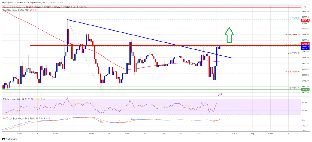 Bitcoin price is recovering higher from the $29,000 support. BTC could revisit the key $29,700 resistance zone in the coming sessions. Bitcoin is slowly moving higher above the $29,200 and $29,300 levels. The price is trading above $29,300 and the 100 hourly Simple moving average. There was a break below a key bearish trend line with resistance near $29,375 on the hourly chart of the BTC/USD pair (data feed from Kraken). The pair could rise toward the next major resistance at $29,700. Bitcoin Price Faces Many Hurdles Bitcoin price retested the $29,050 support zone where the bulls emerged. BTC remained strong above the $29,000 zone and recently started a fresh increase. There was a clear move above the $29,250 and $29,300 levels. The price broke the 50% Fib retracement level of the downward move from the $29,678 swing high to the $29,070 support. Besides, there was a break below a key bearish trend line with resistance near $29,375 on the hourly chart of the BTC/USD pair. Bitcoin is now trading above $29,300 and the 100 hourly Simple moving average. It is now facing resistance near the $29,450 level. It seems like the 61.8% Fib retracement level of the downward move from the $29,678 swing high to the $29,070 support is acting as a resistance. The first major resistance is still near the $29,650 level. The next major resistance is near the $29,700 level, above which the price might rise toward the $30,000 resistance zone. Source: BTCUSD on TradingView.com A close above the $30,000 resistance zone could start a decent increase. In the stated case, the price may even surpass the $30,400 resistance. Fresh Decline in BTC? If Bitcoin fails to clear the $29,700 resistance, it could start a fresh decline. Immediate support on the downside is near the $29,300 level and the 100 hourly Simple moving average. The next major support is near the $29,050 level, below which the price could accelerate lower. The next support is near the $28,800 level. Any more losses might call for a move toward the $28,200 level in the near term. Technical indicators: Hourly MACD – The MACD is now gaining pace in the bullish zone. Hourly RSI (Relative Strength Index) – The RSI for BTC/USD is now above the 50 level. Major Support Levels – $29,200, followed by $29,050. Major Resistance Levels – $29,450, $29,700, and $30,000.
