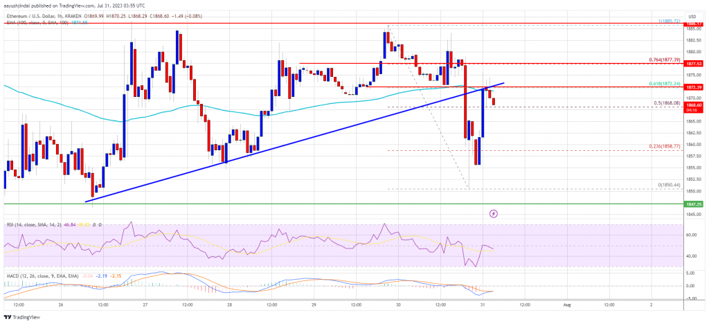 Ethereum price is struggling to clear the $1,880 zone against the US Dollar. ETH could start a fresh decline if it stays below $1,880 and $1,900. Ethereum is facing major resistance near $1,880 and $1,900. The price is trading below $1,875 and the 100-hourly Simple Moving Average. Earlier, there was a break below a key bullish trend line with support near $1,870 on the hourly chart of ETH/USD (data feed via Kraken). The pair is now struggling to rise above the same trend line and $1,880. Ethereum Price Faces Key Resistance Ethereum’s price failed to clear the $1,885 resistance and started a fresh decline. ETH declined below the $1,875 and $1,870 levels within a range, similar to Bitcoin. Besides, there was a break below a key bullish trend line with support near $1,870 on the hourly chart of ETH/USD. The pair tested the $1,850 support and recently started a fresh increase. There was a move above the $1,865 level. The bulls pushed the price above the 50% Fib retracement level of the downward move from the $1,885 swing high to the $1,850 low. Ether is now struggling to rise above the same trend line and $1,880. It is trading below $1,875 and the 100-hourly Simple Moving Average. On the upside, immediate resistance is near the $1,875 level and the 100 hourly SMA. It is close to the 61.8% Fib retracement level of the downward move from the $1,885 swing high to the $1,850 low. Source: ETHUSD on TradingView.com The first major resistance is near the $1,885 level. The next key resistance is near the $1,900 level, above which the price might rise toward the $1,950 zone. Any more gains might send the price toward the $2,000 hurdle. Fresh Decline in ETH? If Ethereum fails to clear the $1,875 resistance, it could start another decline. Initial support on the downside is near the $1,860 level. The first major support is near the $1,850 zone, below which the price might test the $1,820 support zone. The next major support is near the $1,780 support level. Technical Indicators Hourly MACD – The MACD for ETH/USD is losing momentum in the bullish zone. Hourly RSI – The RSI for ETH/USD is now below the 50 level. Major Support Level – $1,850 Major Resistance Level – $1,885