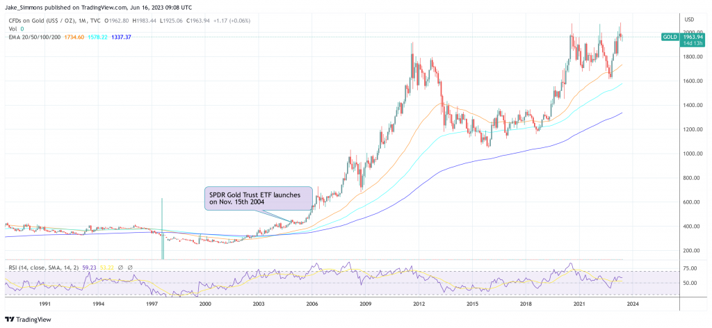 The application by BlackRock, the world’s largest asset manager, for approval of a Bitcoin spot ETF with the US Securities and Exchange Commission (SEC) is the biggest story in the crypto market today. Numerous experts are extremely optimistic that an approval of the first Bitcoin spot ETF in the US will be a massively bullish event, attracting huge amounts of new capital and triggering a new bull run. But where does this theory come from? Bitcoin is often referred to as the digital gold of the 21st century, so it’s an obvious choice to look at the history of gold and the first gold based spot ETF. Why The BlackRock Bitcoin ETF Would Be So Bullish The first thing to note is that BlackRock applied for a spot ETF and not a Futures ETF. The SEC has already approved a number of Bitcoin Futures ETFs that hold Bitcoin futures contracts on the CME. These are currently traded on the US equity markets, but have relatively low popularity. And this has its reasons, first and foremost the so-called “drag”, as Scimitar Capital explains. Drag refers to the underperformance of a fund that attempts to replicate the return of a particular underlying asset and is a long-term result of regular portfolio rebalancing. To track the spot price, BITO, the largest bitcoin futures ETF, holds 2/3 in the front-month future and 1/3 in the following month. Related Reading: Why Is Bitcoin Up Today? However, this “rolling” is costly because of transaction fees, slippage and because futures for the last month are usually traded at a premium over the first month in BTC (“contango”). For this reason, futures ETFs are not a good investment for retail traders in the long run and are therefore unpopular. A Bitcoin spot ETF does not have these disadvantages. “This is the reason why physically backed ETFs like GLD and IAU for gold have a combined 90B of AUM whereas futures backed ones like BITO and USO have a paltry 1.6B,” Scimitar Capital says. The first gold ETF, the SPDR Gold Trust ETF (GLD), was listed on the NYSE on November 15, 2004 and revolutionized gold trading. Before GLD came on the market, it was possible to invest in gold in the form of bars, coins, certificates and shares of gold mining companies. Related Reading: Bitcoin Price Aims $26,200 But 100 SMA Hold The Key In Short-Term The exchange-traded fund made investing in precious metals a no-brainer and eliminated the problems of shipping and vaults. The same revolution could be coming to Bitcoin by a Bitcoin spot ETF. Retail investors could hold Bitcoin long-term through the ETF without worrying about custody and private keys. And the revolution in gold also made itself felt in the price. While the price of gold was still below $450 per ounce in November 2004, gold saw a meteoric rise in the years that followed. In September 2011, less than seven years after the launch, gold was trading at $1920 per ounce. Many economic factors have influenced the price of gold, but the launch of ETFs certainly played an influential role in attracting global institutional funds to the market. The digital gold of the 21st century, Bitcoin, may yet see this price explosion if history repeats itself. At press time, BTC traded at $25,604, reclaiming the 200-day EMA (blue line). Featured image from iStock, chart from TradingView.com