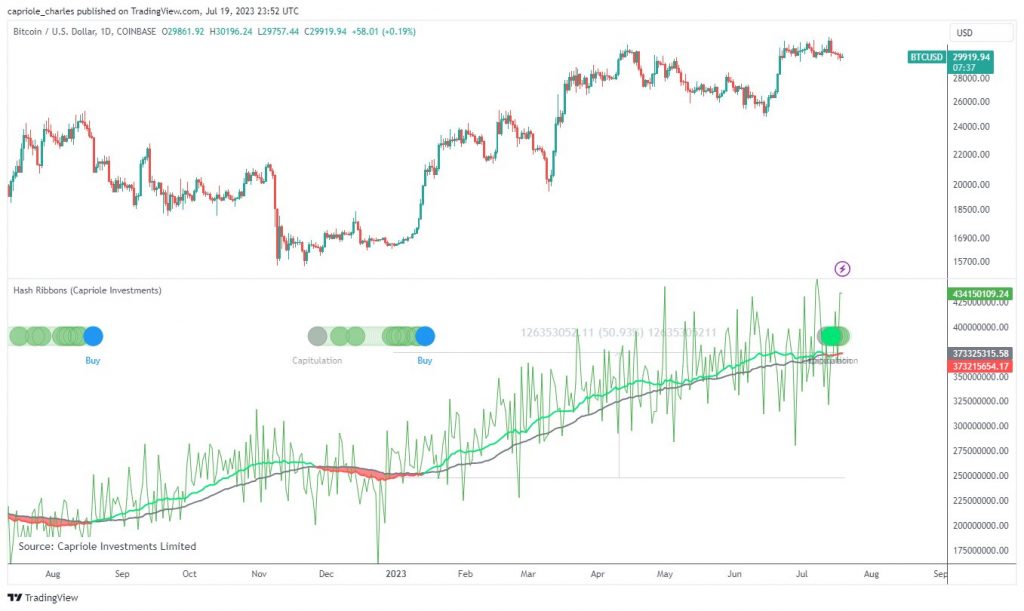 Charles Edwards, the mastermind behind the Bitcoin Hash Ribbons signal and founder of Capriole Investments, has sounded the alarm. The renowned analyst warns that the Hash Ribbons capitulation signal just flashed, a phenomenon that has historically accompanied moments of distress for BTC miners. As outlined by Edwards, Bitcoin’s hash rate had experienced an astonishing and seemingly unsustainable 50% surge in 2023. However, this meteoric rise came to a sudden slowdown, which has led to the Hash Ribbons capitulation signal to appear. Via Twitter, Edwards emphasized that the signal is neither a clear sell signal nor a buy indicator. But it demands prudent risk management until a renewed price rally: We have a Hash Ribbon capitulation. AKA a slowing in Bitcoin’s Hash Rate growth after what has been an incredible (unsustainable) 50% increase in 2023. Hash Ribbons capitulation is not a sell signal, but it’s also not bullish. Risk management warranted until growth resumes. Market analyst Lukasz Wydra corroborates Edwards’ stance, pointing out that the death cross of Bitcoin hash ribbons is a signal of a time of uncertainty. Wydra revealed that historically, there have been 14 similar events, each leading to diverse outcomes. Among these events, three resulted in rallies, six led to sideways movements, and five triggered declines. Related Reading: Bitcoin Bulls Rejoice: Blofin Forecasts $49,000 Price High With Potential Spot ETF Launch Wydra takes a statistical approach and reassures investors that, statistically speaking, the Hash Ribbons capitulation does not inflict significant harm on the market. In fact, he emphasizes that when the capitulation finally subsides, it will usher in a strong buying signal, one that has shown remarkable effectiveness in the past. The last time the Hash Ribbons capitulation signal appeared was at the end of November 2022. It was followed by a prolonged sideways trend for over a month until the buy signal flashed at the beginning of January. The result? Bitcoin embarked on a furious rally, etching a memorable start to the year. Why Bitcoin Hash Ribbons Are Such A Powerful Tool In simple terms, the Hash Ribbon indicator is designed to detect periods when BTC miners are facing distress and possible capitulation. These phases tend to coincide with major lows in the price of Bitcoin, making them attractive buying opportunities for astute investors. Related Reading: Bitcoin, XRP, & Ethereum: Three Top Coins On Brink Of Golden Cross Miners play a crucial role in securing the Bitcoin network and processing transactions. During periods of rapid price surges followed by sharp pullbacks, some miners may find it financially challenging to continue their operations, leading them to power down their mining rigs. Charles Edwards elucidates that when miners capitulate, it might be the most potent buy signal observable in the Bitcoin market. However, the indicator does not claim to time the exact bottom of the price. Instead, it identifies periods when miners are turning off their rigs due to adverse market conditions, leading to drops in hash rates. These moments often correspond to macro bottoms in Bitcoin’s price, making them opportune moments to accumulate Bitcoin. At press time, BTC traded near the range lows at $29,863. Featured image from iStock, chart from TradingView.com