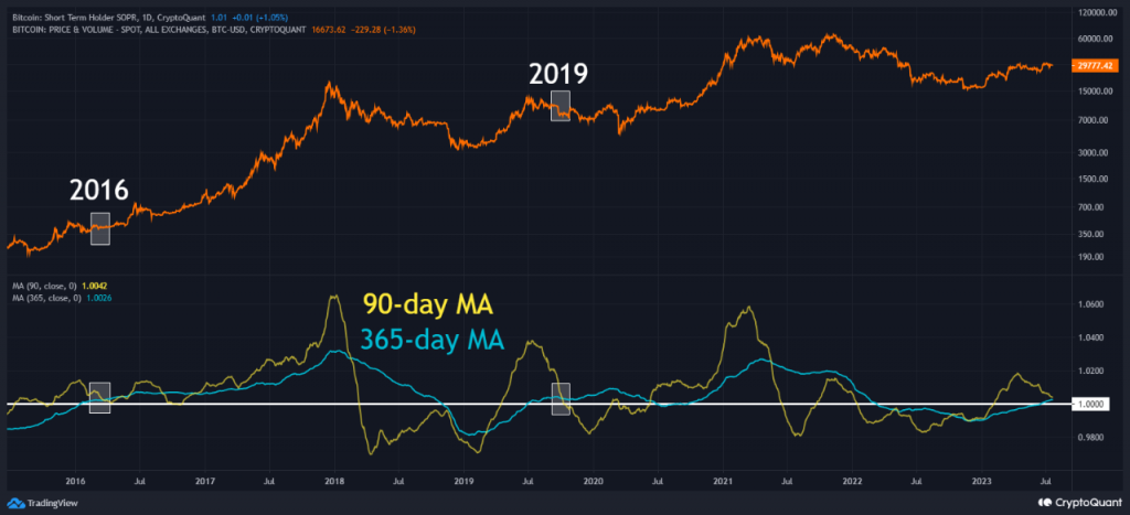 On-chain data shows a Bitcoin indicator is near a crucial retest currently that may decide where the cryptocurrency will go next from here. Which Pattern Will Bitcoin Follow Next: 2016 Or 2019? As pointed out by an analyst in a CryptoQuant post, the BTC SOPR for short-term holders is approaching the baseline. The “Spent Output Profit Ratio” (SOPR) is an indicator that tells us whether Bitcoin investors are selling/moving their coins at a profit or at a loss right now. When the value of this metric is greater than 1, it means that the average holder in the market is realizing some amount of profit with their selling currently. On the other hand, values below this threshold suggest loss taking is the dominant force in the market at the moment. Naturally, the SOPR being exactly equal to the 1 baseline implies the total amount of profits being realized are exactly canceling out the amount of losses as the market as a whole is neutral. This SOPR is for the entire Bitcoin market, but in the context of the current discussion, the relevant version of the metric is the one for just a single segment of the market: the “short-term holders” (STHs). The STH group includes all the investors who purchased their coins less than 155 days ago. This cohort generally includes the weak hands of the market, who may easily react to fluctuations in the market. Now, here is a chart that shows the trend in the 90-day and 365-day moving averages (MAs) of the Bitcoin STH SOPR over the last few years: Looks like both the metrics have been above the baseline in recent days: Source: CryptoQuant As displayed in the above graph, the 90-day MA of the Bitcoin STH SOPR (colored in yellow) broke out above the 1 baseline back when this rally first started around the beginning of the year. This breakout suggested a shift towards profit selling for these investors, something that has historically been observed in all previous major rallies in the cryptocurrency. With the latest leg in the Bitcoin rally above the $30,000 mark, the 365-day MA of the indicator (highlighted in blue) has also managed to climb up above this mark. Related Reading: Bitcoin Exchange Inflow Spikes, Is This Bearish? While this has been happening, though, the 90-day MA has actually been heading down and is now about to cross below the 365-day MA as it approaches the 1 baseline. In the chart, the quant has marked the two previous instances where a trend similar to this had formed for the asset. It looks like back in 2016 when the 90-day MA had retested the 1 mark after a similar structure had taken shape, the metric had found support at the break-even mark. This rebound kept Bitcoin going and the coin eventually built up into a bull market. In 2019, though, the retest of the 90-day MA STH SOPR failed and a bearish trend once again took over the coin. It wouldn’t be until 160 days later that bullish sentiment returned and the rally happened. Related Reading: Bitcoin Has Broken This Open Interest Pattern, Quant Explains As the current Bitcoin market looks to be in a similar spot as these two historical occurrences, it’s possible that it may follow the lead of one of these. It now remains to be seen, as to which of these patterns the asset might exhibit this time. BTC Price At the time of writing, Bitcoin is trading around $30,300, down 1% in the last week. BTC has surged during the past day | Source: BTCUSD on TradingView Featured image from Kanchanara on Unsplash.com, charts from TradingView.com, CryptoQuant.com