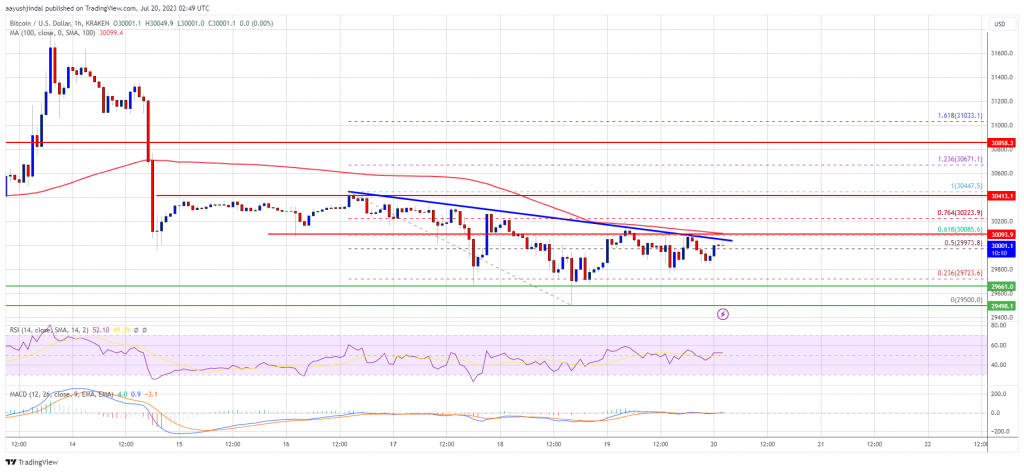 Bitcoin price is consolidating above $29,500. BTC could start a decent increase if it clears the $30,200 resistance zone in the near term. Bitcoin is struggling to gain bullish momentum from the $29,500 level. The price is trading below $30,100 and the 100 hourly Simple moving average. There is a key bearish trend line forming with resistance near $30,020 on the hourly chart of the BTC/USD pair (data feed from Kraken). The pair could start a steady increase if there is a close above the $30,200 resistance. Bitcoin Price Holds Support Bitcoin price remained well-bid above the $29,500 level. BTC formed a support base and recently corrected a few points higher. There was a minor increase above the$29,850 resistance zone. The price climbed above the 50% Fib retracement level of the key drop from the $30,447 swing high to the $29,500 low. However, the bears are still active near the $30,050 level. There is also a key bearish trend line forming with resistance near $30,020 on the hourly chart of the BTC/USD pair. Bitcoin is now trading below $30,100 and the 100 hourly Simple moving average. Immediate resistance is near the trend line zone. The first major resistance is near the $30,085 level. It is close to the 61.8% Fib retracement level of the key drop from the $30,447 swing high to the $29,500 low. Source: BTCUSD on TradingView.com The next major resistance is near $30,450. A close above the $30,450 level might start a fresh increase. In the stated case, the price could rise toward the $30,850 level. Any more gains could open the doors for a move toward the $31,200 resistance zone. More Losses in BTC? If Bitcoin fails to clear the $30,085 resistance, it could continue to move down. Immediate support on the downside is near the $29,800 level. The next major support is near the $29,500 level, below which the price could continue to move down. In the stated case, the price could drop toward the $29,200 support zone. Any more losses might send the price toward the $28,400 level in the near term. Technical indicators: Hourly MACD – The MACD is now losing pace in the bearish zone. Hourly RSI (Relative Strength Index) – The RSI for BTC/USD is now above the 50 level. Major Support Levels – $29,650, followed by $29,500. Major Resistance Levels – $30,085, $30,450, and $31,200.