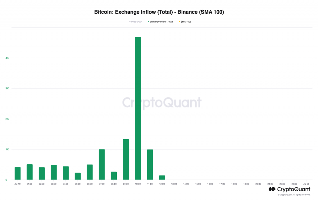 On-chain data shows the Bitcoin exchange inflow towards Binance has spiked during the past day, which may be bearish for the price. Bitcoin Exchange Inflow Has Registered A Large Spike As an analyst in a CryptoQuant post pointed out, a whale has made a large deposit to the cryptocurrency exchange Binance. The relevant indicator here is the “exchange inflow,” which measures the total amount of Bitcoin that investors send to a specific centralized exchange (which, in this case, is Binance). When the value of this metric is high, it means that the holders are depositing large amounts to the platform right now. The investors may have made these transfers for selling-related purposes, depending on which type of exchange these inflows are for. Naturally, if that is the case, the price could feel a bearish effect from the inflows. On the other hand, low values imply the exchange in question isn’t receiving that many coins currently. Such a trend would imply that the market’s selling pressure may be low. Related Reading: Bitcoin Has Broken This Open Interest Pattern, Quant Explains Now, here is a chart that shows the trend in the Bitcoin exchange inflow for the cryptocurrency exchange Binance over the past day: The value of the metric seems to have been quite high in recent hours | Source: CryptoQuant As shown in the above graph, the Bitcoin exchange inflow for Binance has observed a rather large spike in the past day. With this deposit, around 4,451 BTC (approximately worth $133 million at the current exchange rate) has entered the platform’s wallets. Interestingly, this deposit has come from a whale that has bought 20,000 BTC over the last eight months, meaning that the investor still has over 15,000 BTC left in their wallet after the transaction. The whale may have made this transfer to take some profit at the current prices. Since the scale of the deposit is quite sizeable, it could potentially cause bearish ripples in the market. However, as another quant has explained, the deposits have been towards the derivatives side of the exchange and not the spot platform. Looks like the spot exchanges inflow hasn’t moved today | Source: CryptoQuant It would appear likely that the transfer hasn’t been made to sell the coins (at least not directly) but rather for opening positions on the derivatives market. Related Reading: Signal With Perfect Track Record Predicts Bitcoin Bull Market Parabola: Analyst “This category of large wallets rarely moves directly to derivative exchanges,” notes the analyst, given that the size of the wallet in question is in the 10,000+ BTC range, the class of the largest whales on the network. Such a large position can lead to volatility in the Bitcoin price, but unlike selling from spot deposits, this price action may not necessarily be bearish for the asset. BTC Price At the time of writing, Bitcoin is trading around $29,800, down 3% in the last week. BTC has gone downhill during the last few days | Source: BTCUSD on TradingView Featured image from Kanchanara on Unsplash.com, charts from TradingView.com, CryptoQuant.com