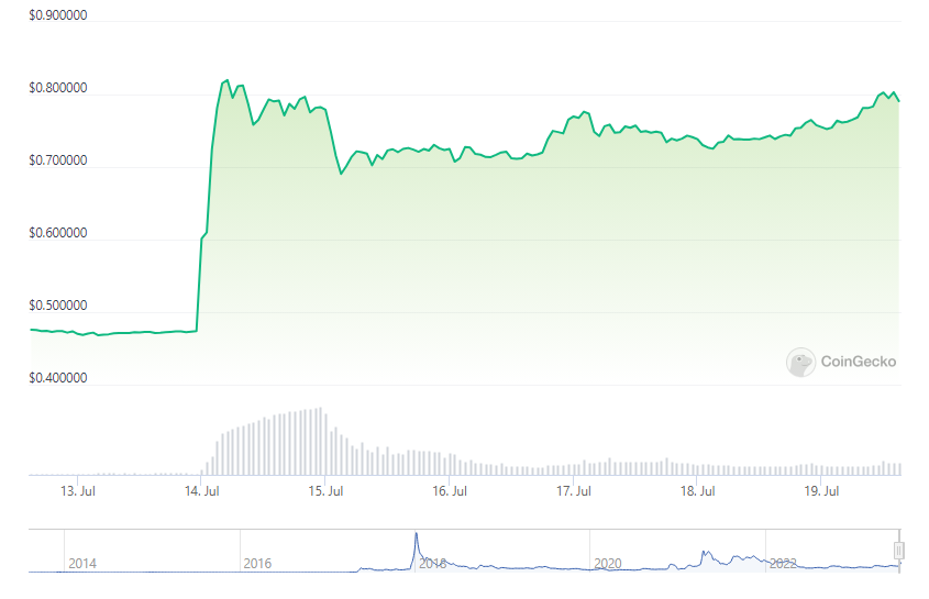A U.S. district judge decided that XRP was not a security after Ripple’s victory over the United States Securities and Exchange Commission; the token’s price has since surged sharply. Among the top 25 cryptocurrencies, the token native to the Ripple payment system had the best 24-hour performance. XRP has regained the number four spot by market capitalization, moving past Binance’s problematic BNB coin. Importantly, XRP held its ground, unaffected by the turmoil gripping the broader crypto market as the leading cryptocurrency Bitcoin threatens to lose its grip on the crucial $30,000 handle, and many altcoins begin the day in a sea of red. Related Reading: This Under-The-Radar Coin Just Beat The Top 100 Cryptocurrencies With 120% Explosion XRP is a cryptocurrency that Ripple employs to transfer funds internationally. With a market capitalization of $37.8 billion, it is the fifth-largest cryptocurrency in circulation. XRP Dominates The Weekly Timeframe According to crypto market tracker Coingecko data, XRP was trading at $0.814, an increase of nearly 10% over the previous 24 hours. At the time of writing, however, it was in the weekly timeframe that the token proved its worth, skyrocketing by nearly 68%. Source: Coingecko Bitcoin (BTC) and ether (ETH), the two largest cryptocurrencies by market capitalization, are currently trading below their psychologically significant price levels of $30,000 and $1,500, respectively. Although Bitcoin’s price has been fluctuating around the $30,000 mark recently, Jake Boyle, Chief Commercial Officer of Australian crypto exchange Caleb & Brown, has stated that significant price changes are unlikely unless certain crucial events transpire. For the past three years, Ripple has fought the SEC on claims that the company and two of its executives made an illicit $1.3 billion in sales of XRP. Ripple has refuted these allegations, maintaining that XRP is more akin to a commodity than a security. XRP price movement in the weekly chart. Source: Coingecko. A Watershed Moment For Ripple The SEC Ripple lawsuit’s ruling was a significant moment for cryptocurrencies. Although XRP was deemed not a security, certain token sales were classified as securities transactions. This decision sheds light on the regulatory status and classification of cryptocurrencies by the SEC, impacting the entire industry. It may trigger discussions and lead to clearer regulations for digital assets, boosting investor confidence and fostering a more stable market. The ruling’s ripple effects (no pun intended) may extend globally, influencing other countries’ regulatory approaches. XRP market cap currently at $41.5 billion on the daily chart: TradingView.com Related Reading: Elon Musk Fires Another Tweet – But Did It Lift Dogecoin Price? Regulatory Clarity A Must As the cryptocurrency ecosystem matures, regulatory clarity becomes crucial for striking a balance between innovation and consumer protection. Market participants will closely monitor how this ruling shapes the future of cryptocurrency regulation. Meanwhile, if the court had sided with the SEC, it might have established a negative precedent for treating other cryptocurrencies, opening the door to more stringent regulations and control. This would have repercussions for any venture with an initial coin offering (ICO) or token sale, including Ripple and XRP. (This site’s content should not be construed as investment advice. Investing involves risk. When you invest, your capital is subject to risk). Featured image from Muscle & Fitness
