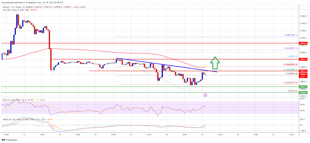 Bitcoin price is attempting a fresh increase from $29,500. BTC could gain bullish momentum if it clears the $30,200 resistance zone in the near term. Bitcoin is slowly moving higher from the $29,500 level. The price is trading below $30,200 and the 100 hourly Simple moving average. There is a major bearish trend line forming with resistance near $30,100 on the hourly chart of the BTC/USD pair (data feed from Kraken). The pair could start a decent increase if there is a close above the $30,200 resistance. Bitcoin Price Aims Higher Bitcoin price followed a bearish path below the $30,200 pivot level. BTC even broke the $29,850 level and tested the $29,500 level. A low is formed near $29,500 and the price is now attempting a fresh increase. The price climbed above the $29,850 and $30,000 resistance levels. There was a move above the 50% Fib retracement level of the downward move from the $30,448 swing high to the $29,500 low. The price is now consolidating near $30,000. Bitcoin price is still trading below $30,200 and the 100 hourly Simple moving average. Immediate resistance is near the $30,080 level. There is also a major bearish trend line forming with resistance near $30,100 on the hourly chart of the BTC/USD pair. The trend line is near the 61.8% Fib retracement level of the downward move from the $30,448 swing high to the $29,500 low. The first major resistance is near $30,200. A close above the $30,200 level might start a fresh increase. Source: BTCUSD on TradingView.com The next major resistance is near the $30,500 level. Any more gains could open the doors for a move toward the $31,000 resistance zone. More Losses in BTC? If Bitcoin fails to clear the $30,200 resistance, it could continue to move down. Immediate support on the downside is near the $29,650 level. The next major support is near the $29,500 level, below which the price could gain bearish momentum. In the stated case, the price could drop toward the $29,200 support zone. Any more losses might send the price toward the $28,750 level in the near term. Technical indicators: Hourly MACD – The MACD is now gaining pace in the bullish zone. Hourly RSI (Relative Strength Index) – The RSI for BTC/USD is now above the 50 level. Major Support Levels – $29,650, followed by $29,200. Major Resistance Levels – $30,100, $30,200, and $30,500.