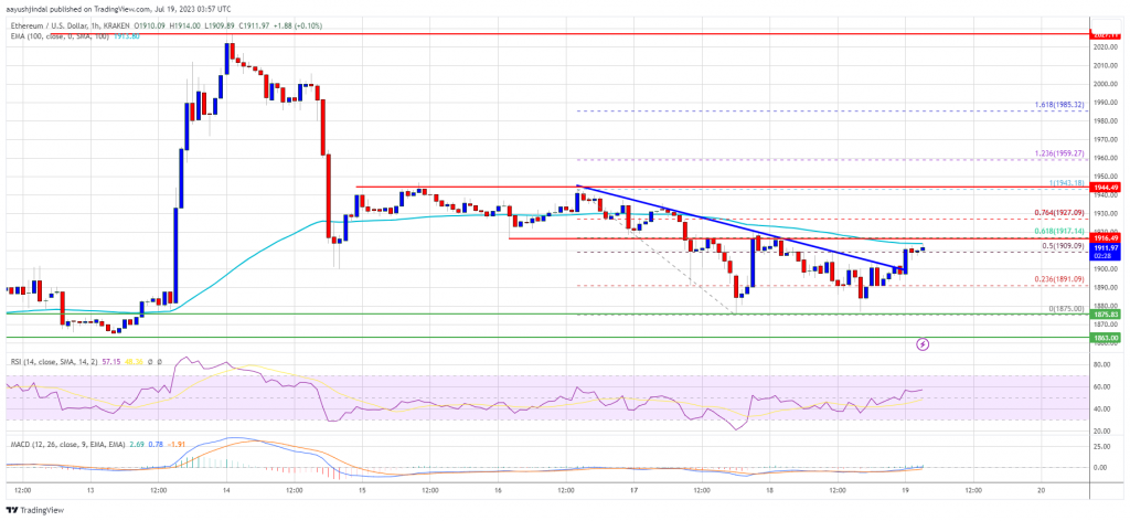 Ethereum price is finding bids above the $1,875 support zone against the US Dollar. ETH could gain bullish momentum above the $1,940 resistance. Ethereum is holding the key support near $1,875. The price is trading below $1,920 and the 100-hourly Simple Moving Average. There was a break above a key bearish trend line with resistance near $1,900 on the hourly chart of ETH/USD (data feed via Kraken). The pair could gain pace if it clears the $1,920 and $1,940 resistance levels. Ethereum Price Could Start Fresh Increase Ethereum’s price declined again below the $1,900 support. However, ETH bulls were active near the $1,875 level. It seems like a double bottom pattern is forming near the $1,875 level. A low is formed near $1,875 and the price is now attempting a fresh increase. It broke the $1,900 resistance level. There was also a break above a key bearish trend line with resistance near $1,900 on the hourly chart of ETH/USD. The pair cleared the 50% Fib retracement level recent drop from the $1,944 swing high to the $1,874 low. Ether is now trading below $1,920 and the 100-hourly Simple Moving Average. On the upside, immediate resistance is near the $1,920 level. It is close to the 61.8% Fib retracement level recent drop from the $1,944 swing high to the $1,874 low. Source: ETHUSD on TradingView.com The first major resistance is near the $1,940 zone, above which the price could rise toward the $1,985 resistance zone. The next major resistance is near the $2,000 level. Any more gains could send Ether toward the $2,050 resistance or even $2,080. Fresh Decline in ETH? If Ethereum fails to clear the $1,920 resistance, it could start a fresh decline. Initial support on the downside is near the $1,900 level. The first major support is near the $1,875 level, below which the price could extend its decline. The next major support is near the $1,825 support level. Any more losses could open the doors for a move toward the $1,780 support level in the near term. Technical Indicators Hourly MACD – The MACD for ETH/USD is gaining momentum in the bullish zone. Hourly RSI – The RSI for ETH/USD is now above the 50 level. Major Support Level – $1,875 Major Resistance Level – $1,920