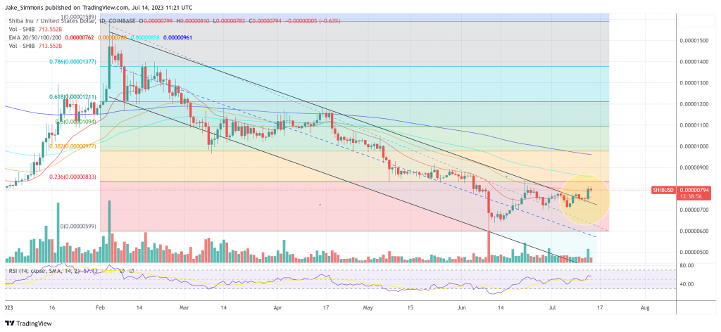 The Shiba Inu price has risen over 5% in the last 24 hours amid the market-wide hype surrounding Ripple’s partial victory in its legal battle with the US Securities and Exchange Commission (SEC). But SHIB investors should still be cautious: While the SHIB price shows a clear uptrend of 23% over the last 30 days, a complete confirmation of a trend reversal is still pending. Shiba Inu Price Analysis Technically, the Shiba Inu price remains in bearish territory for several reasons. As explained in previous analyses, the Shib price entered a downtrend channel in early February this year. The breakout from the bearish chart pattern succeeded six days ago, however, there is still a possibility that it is a fakeout. Shib’s trading volume was rather below average during and after the breakout. Only yesterday there was a noticeable increase. Within the last few hours, trading volume rose to $232 million, 200% higher than the previous day. In the best case, the volume should remain high to avoid a fakeout. Related Reading: Shiba Inu Whale Holding 10% Of Total SHIB Supply Shocks The Market More of a bearish argument is that yesterday’s SHIB rally stopped at $0.00000813. Thus, the price could not break above resistance at $0.00000816, nor could it set a new local high on the 4-hour chart. A look at the 1-day chart also shows that the SHIB price continues to trade below the 23.6% Fibonacci retracement level at $0.00000832. The following days could become crucial to confirm a sustainable trend change or a fakeout. The battle between bulls and bears is still in full swing. The bull side would ideally like to break out above the 23.6% Fibonacci retracement level with a high trading volume. This could be a first confirmation for a sustainable trend change. Related Reading: Shiba Inu (SHIB) Breakout Alert: Potential 30% Rally Looming In this case, the 38.2% Fibonacci retracement level at $0.00000977 could come into focus. Close to it is also the long-term “bull boundary line”, the 200-day exponential moving average (EMA) at $0.00000961. If SHIB also exceeds this level, one can finally speak of a trend reversal. Before that, however, the current gains stand on shaky legs. Shibarium As Catalyst As NewsBTC reported, Shiba Inu chief developer Shytoshi Kusama has hinted a few days ago that the long-awaited layer-2 solution Shibarium will be unveiled along with numerous other innovations at the ETHToronto conference on August 15-16. With only 32 days left until this event, the hype could undoubtedly serve as a catalyst for SHIB. At least Shiba Inu ecosystem token BONE has already benefited from the announcement, raking in high double-digit percentage gains. Just today, Kusama fueled anticipation for Shibarium when he announced the relaunch of the official Shiba Inu website Shib.io. Via Twitter, Kusama teased “Enjoying the summer of Shibarium.” As the #summerofshibarium continues we are proud to introduce new branding for https://t.co/vRofmNPr53 and other #SHIBARMY websites! Give it a look! #WOOF pic.twitter.com/TY7x5hlDS5 — Shytoshi Kusama™ (@ShytoshiKusama) July 13, 2023 Featured image from Twitter, chart from TradingView.com