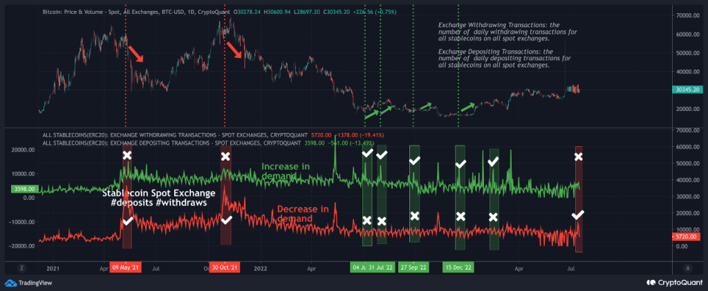 On-chain data shows the stablecoin exchange deposits have remained low recently. Here’s what this may mean for Bitcoin. Stablecoin Exchange Deposits Stay Low, While Withdrawals Jump As pointed out by an analyst in a CryptoQuant post, the fact that the stablecoin exchange withdrawals have spiked while deposits have stayed low may be slightly alarming for BTC. There are two indicators of relevance here: the “stablecoin exchange withdrawing transactions” and the “stablecoin exchange depositing transactions.” As their names already imply, these metrics track the total number of withdrawals and deposit transfers, respectively, that investors of the ERC-20 stables are making right now. Generally, investors seek the safety of these fiat-tied tokens whenever they want to escape the volatility associated with the other assets in the sector. Eventually, when these holders think that the prices are right to jump back into the volatile markets, they swap their stables back for their desired cryptocurrency. These investors usually make use of centralized exchanges for this purpose. So, when the exchange withdrawing transactions are high, it can be a sign that holders are exchanging coins like Bitcoin for stablecoins right now. Related Reading: Here’s What On-Chain Data Reveals About XRP Rally On the other hand, the deposits being high can imply these investors are looking to buy volatile assets using their stables. Naturally, in the former case, Bitcoin and others may feel a bearish effect from the selling, while in the latter case, the prices might see a bullish boost. Now, here is a chart that shows the trend in the stablecoin exchange withdrawing and depositing transactions over the past couple of years: Looks like only one of these two metrics has had a high value recently | Source: CryptoQuant As displayed in the above graph, the stablecoin exchange depositing transactions metric has been relatively low for a while now. This would suggest that there may not be enough demand for converting stables into other assets right now. From the graph, it’s visible that the last time the indicator spiked was back in March of this year. Following the deposits back then, Bitcoin observed a sharp rebound in its price as the rally saw a revival. The timing of these inflows might mean that it was the buying from these stablecoin holders that had provided the fuel for the BTC surge. Related Reading: Bitcoin MVRV At Critical Level: Will A Break Happen? In the graph, the quant has marked other similar past instances as well. It looks like the BTC price generally observes a rise after stablecoin deposits spike, given that the withdrawals are low at the same time. Recently, however, only the stablecoin withdrawals have observed a spike, implying that investors are taking these tokens away from exchanges, likely to hold onto them for extended periods in self-custody. As there aren’t any deposits happening to counteract this, the BTC price has been struggling recently. If the trend continues and more stablecoin withdrawals continue to take place, it’s possible that the cryptocurrency could take a hit in the short term. Bitcoin Price At the time of writing, Bitcoin is trading around $30,200, up 1% in the last week. BTC has taken a hit recently | Source: BTCUSD on TradingView Featured image from iStock.com, charts from TradingView.com, CryptoQuant.com