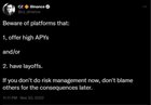 November 30th CZ Binance tweeted beware of platforms that offer High APYs and/or have layoffs if you don't do risk management now, don't blame others for the consequences later https://preview.redd.it/xplzqzt9zecb1.jpg?width=1024&format=pjpg&auto=webp&s=01a614d17b84630c56f2b9bec3938415192becc5 fast forward to today and the headlines are about Binance laying off thousands of employees https://preview.redd.it/kl7xyccxzecb1.png?width=1082&format=png&auto=webp&s=55ce4c938db2f4ca546cef971de66aaf997d5d21 It also turns out that Binance offers high…