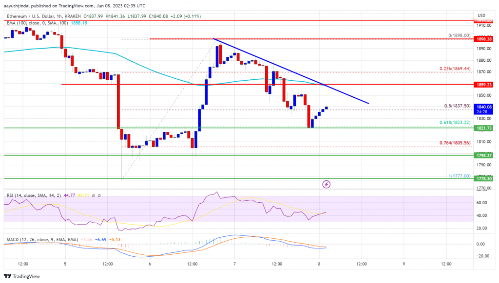 Bitcoin price is correcting lower from the $27,400 resistance. BTC could start a fresh increase if it is able to clear the $26,600 resistance zone. Bitcoin started a fresh decline after it failed to clear the $27,400 resistance. The price is trading below $26,600 and the 100 hourly Simple moving average. There is a key declining channel forming with resistance near $26,580 on the hourly chart of the BTC/USD pair (data feed from Kraken). The pair could attempt a fresh increase if it clears the $26,580 and $26,600 levels. Bitcoin Price Holds Support Bitcoin price was able to climb back above the $27,000 level. BTC even climbed above $27,200 before the bears appeared near the $27,400 zone. A high was formed near $27,368 before the price started a fresh decline. There was a move below the $27,000 support zone. The price declined below the 50% Fib retracement level of the upward move from the $25,368 swing low to the $27,368 high. Bitcoin price is now trading below $26,600 and the 100 hourly Simple moving average. There is also a key declining channel forming with resistance near $26,580 on the hourly chart of the BTC/USD pair. However, it is holding the $26,200 support and the 61.8% Fib retracement level of the upward move from the $25,368 swing low to the $27,368 high. Immediate resistance is near the $26,580 level and the channel zone. The next major resistance is near the $26,600 level. A close above $26,600 might send the price further higher. Source: BTCUSD on TradingView.com The next key resistance is near the $27,000 level. A clear move above the $27,000 resistance might call for a move toward the $27,400 resistance. Any more gains above the $27,400 resistance zone might send the price toward the $28,500 resistance zone. More Losses in BTC? If Bitcoin’s price fails to clear the $26,600 resistance, it could continue to move down. another decline. Immediate support on the downside is near the $26,200 level. The next major support is near the $25,840 level, below which the price might gain bearish momentum. In the stated case, the price could drop toward the $25,400 support. Technical indicators: Hourly MACD – The MACD is now gaining pace in the bearish zone. Hourly RSI (Relative Strength Index) – The RSI for BTC/USD is below the 50 level. Major Support Levels – $26,200, followed by $25,840. Major Resistance Levels – $26,600, $27,000, and $27,400.