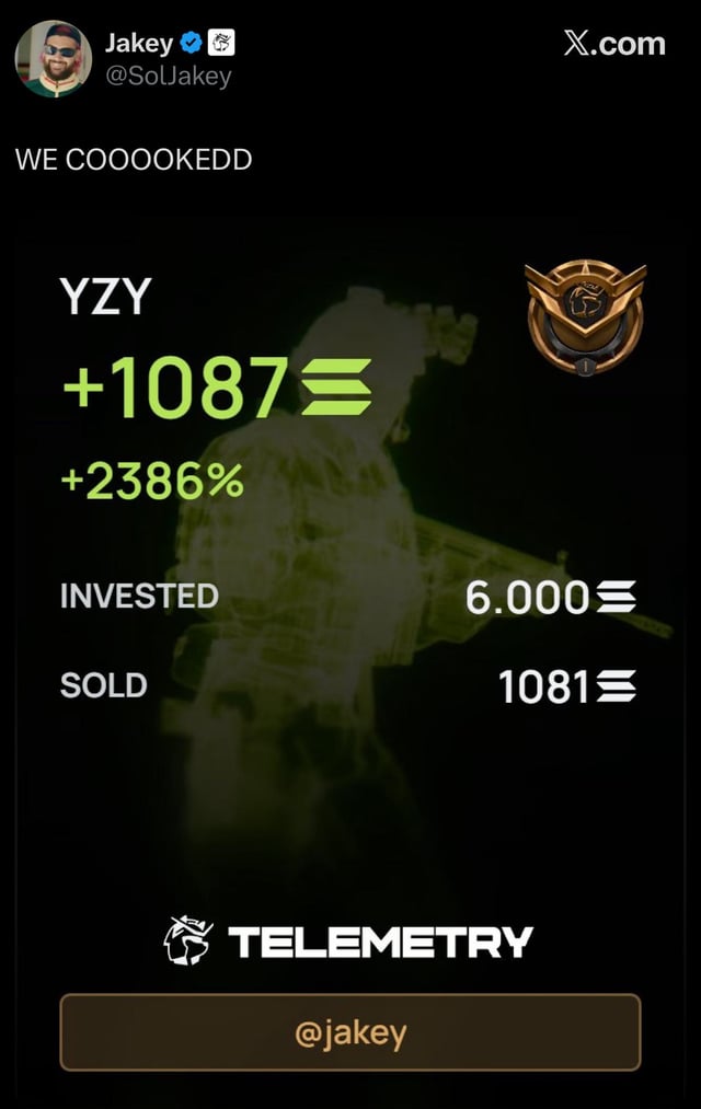 “Kanye” launches $YZY meme token. A suspected meme coin inside trader posts a screenshot of 24x gain shortly after launch. These guys are not your friends. Stop giving them your money.